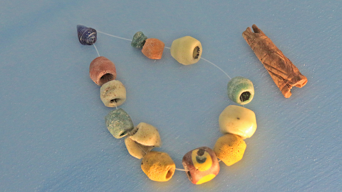 Glasperlen und ein Geweihanhänger (eine sogenannte Donarkeule) einer Halskette - Quelle: Infozentrum Via Claudia Augusta in Roßhaupten