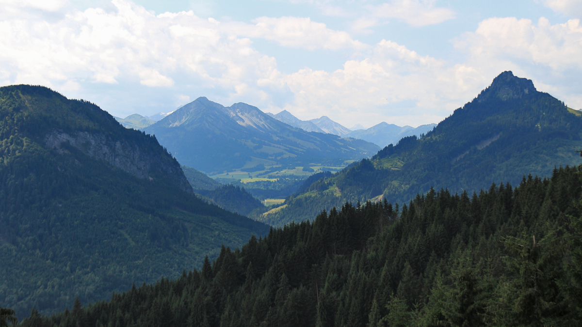 Blick über das Vilstal hinüber zum Oberjoch - rechts der Sorgschrofen