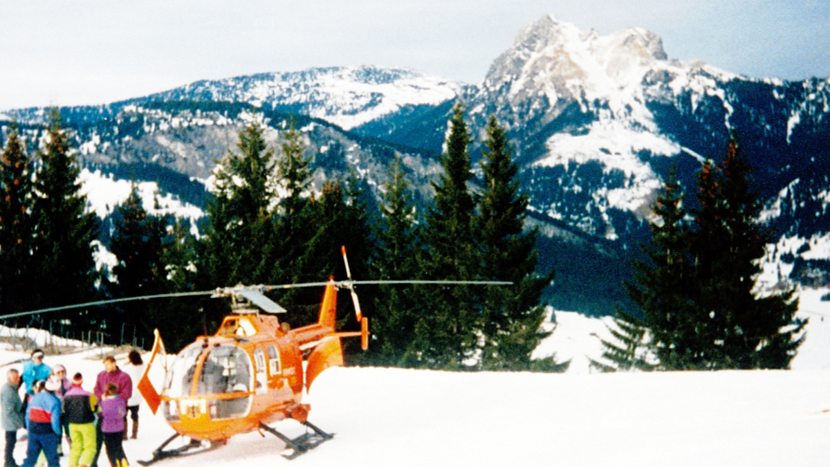 der Rettungshubschrauber Christoph 17 aus Kempten musste zur Bergung eines Verunfallten an der Mittelstation am Neunerköpfle landen (Aufnahme von ca. 1989)