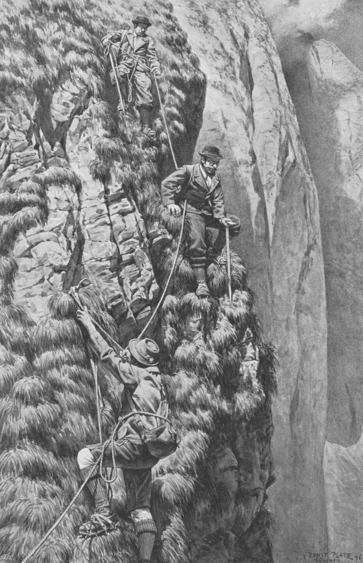 In den Wänden über dem Rothen Loch (Abstieg über die Südost-Wand der Höfats) - gezeichnet von Ernst Platz (1896)