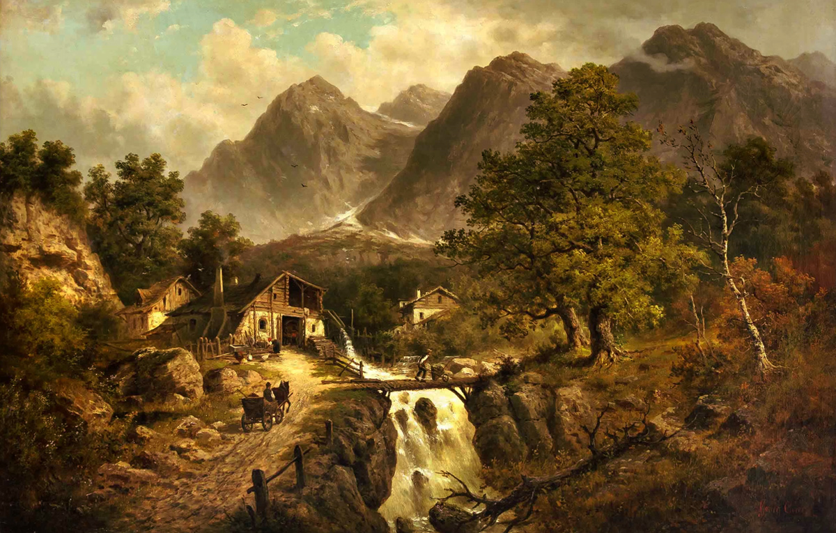 die Szene als Gebirgslandschaft mit Hammerschmiede schuf der Landschaftsmaler Julius Rose - signierte jedoch unter seinem Pseudonym Georg Carré
