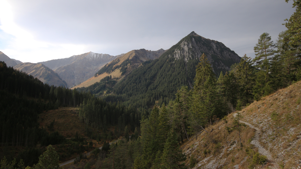 Ausblick vom Namloser Jägersteig hinüber zum Kreuzspitzkamm (Anhalter Höhenweg) und dem dicht mit Latschen bewachsenen Brunnenkopf