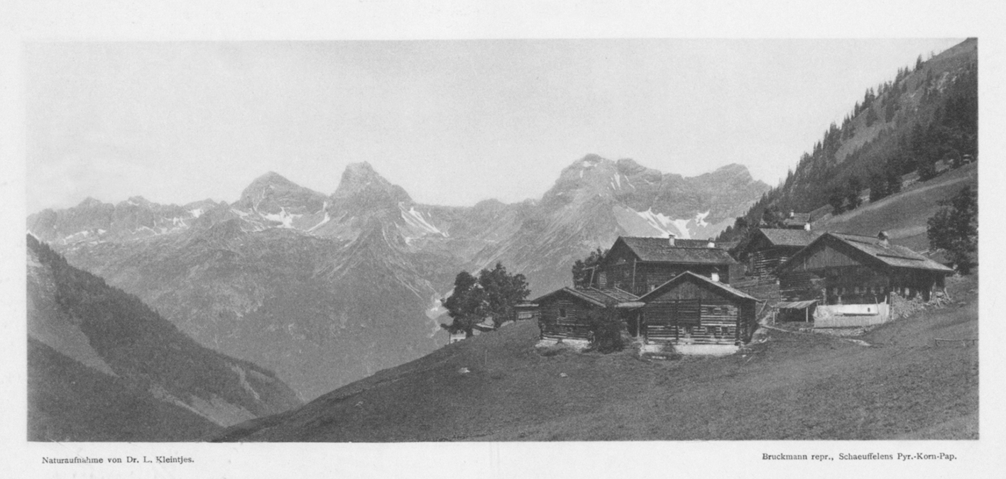 die alten Höfe von Bschlabs mit der Hornbachkette im Hintergrund - aus Zeitschrift des deutschen und österreichischen Alpenvereins (Ausgabe 1908)