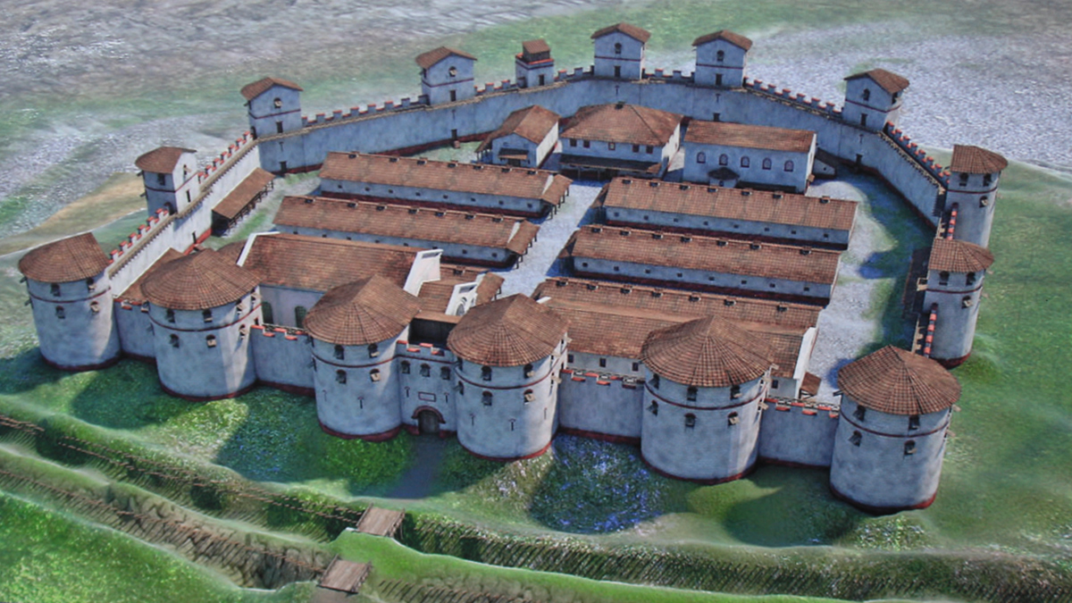 Rekonstruktion des spätrömischen Kastells Caelius Mons (Kellmünz) - Abbildung im Gelände des Archäologischen Parks im Ortszentrum von Kellmünz