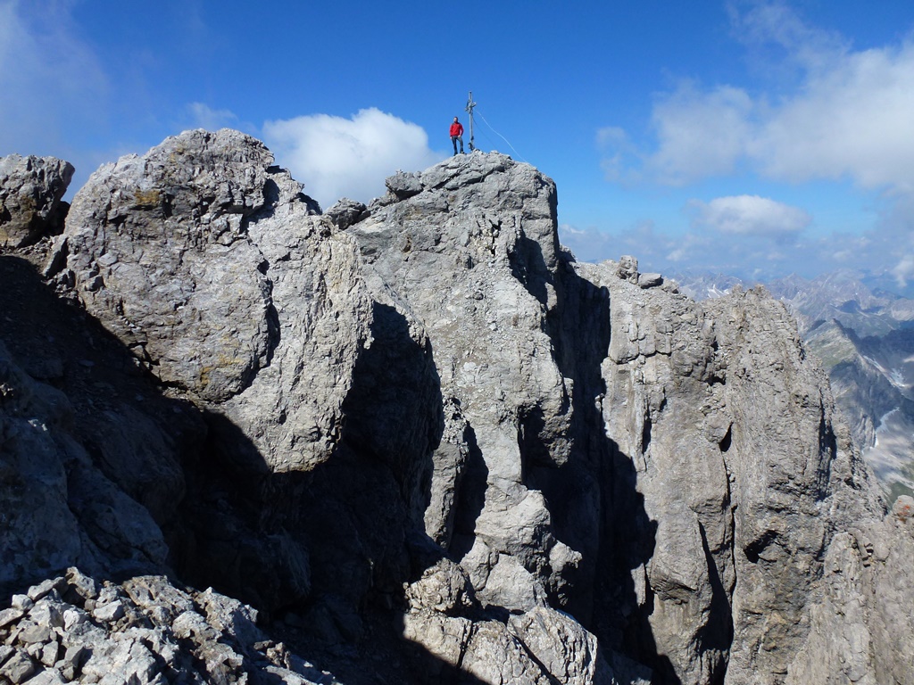 Der Anstieg im Kamin kurz nach den Schneerinnen die zum Brunnkarjoch zeigen war wirklich heikel. Mühsame Spurarbeit und Stufen ohne Hilfsmittel in sommerhartem Altschnee. Der Besuch des Kreuzgipfels (bei uns auch leicht vereist) ist mit II zu bewerten und natürlich Pflicht.