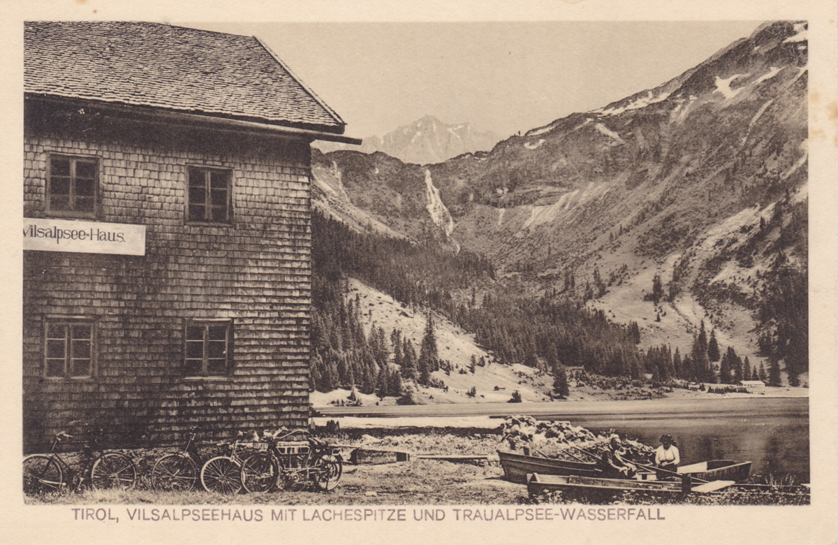 das Vilsalpseehaus mit Lachespitze und Traualpsee-Wasserfall (ca. 1920)