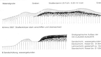 Ein auffälliger Damm leitet in der Talebene angekommen von der Katzenmühle gegen das nördlich liegende Reutte und dem Drei-Tannen-Stadion, welcher möglicherweise dem Verlauf der Via Claudia entsprechen könnte. Durch die baulichen Maßnahmen im Umfeld des Alpenbades, gerade in den letzten Jahren, wurden sämtliche antike Spuren überbaut oder verwischt.