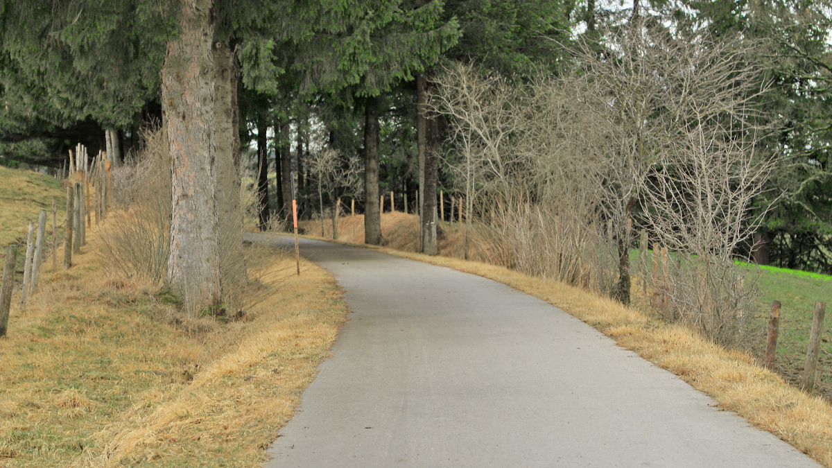 Durch leicht kupiertes Gelände setzt die Trasse ihren Weg nach Norden fort, zwischen dem Hartenberg und dem Egelmoosner Filz hindurch, wo die alte Trasse vermutlich noch als kurzer Wall zwischen zwei Bäumen ersichtlich ist. Bei Egelmoosen etwas flacher als der heutige Radweg und weiter nördlich ausholend schneidet sie etwa 150 Meter weiter im Norden der kleinen Hofgruppe die gegenwärtige Zufahrtsstraße und leitet etwas oberhalb des Asphaltsträßchens in Richtung Nordost um sich als geradlinige Spur bis Lechbruck hinab als der heutige Radweg hin zu ziehen.