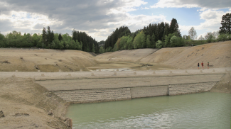 Einst eine ausgedehnte Wildflusslandschaft, wurde 1950 mit dem Bau eines Wasserkraftwerkes begonnen. 1952 wurde die Stauung gestartet und 1954 war das Bauprojekt fertig gestellt. Dabei wurden dutzende Wohnhäuser und Bauernhöfe zweier Weiler aufgelassen und zumeist in den umliegenden Orten wieder aufgebaut. Ganze Ortsteile wurden geflutet, darunter auch der namengebende Weiler Forggen. Mit auf den Grund des neuen Sees gesunken sind aber auch große Abschnitte der römischen Via Claudia und mehrere römerzeitliche Bauten wie die römische Siedlung Dietringen, ein Depotfund im Umfeld einer möglichen Rast- (mansiones), und Pferdewechselstation (mutationes) am Ausgang des Tiefentals.