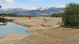 Am nördlichen Ende des Forggensees quert die antike Staatsstraße den Abfluss aus dem Tiefental um dann, im Bereich des heutigen Postens der Wasserwacht ansteigend, den Weg Richtung Mangmühle einzuschlagen. Eine eindeutige Zuordnung des Verlaufes der Trasse konnte ich nicht treffen, zunächst verläuft sie offenbar aber wenige Meter westlich des heutigen Fahrweges. Ob die frühmittelalterlich alamannische Befestigungsanlage östlich des Verlaufes der Via Claudia schon in vorrömischer Zeit einen Vorgängerbau vorweisen kann ist noch nicht geklärt, für die Mangmühle selbst wurde jedoch eine Ansiedlung der römischen Kaiserzeit nachgewiesen.