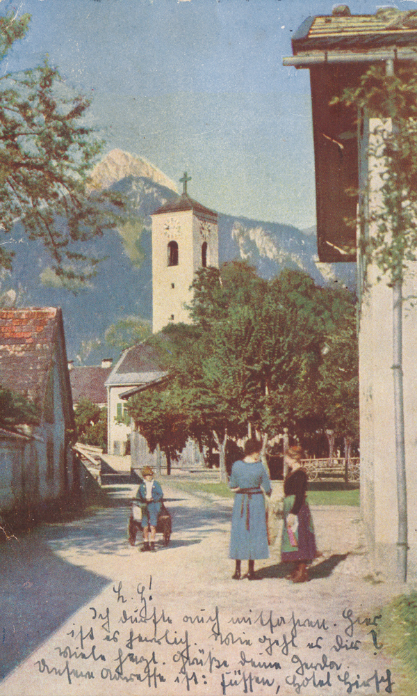 Idyll in der Reuttener Schulstraße mit Blick zur Klosterkirche St. Anna - Wagner'sche Universitäts-Buchdruckerei (Karte gelaufen 1936)