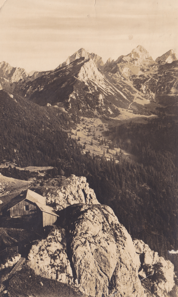 die Pfrontner Hütte mit Blick hinüber zu den Tannheimer Felsbergen - Verlag Falkenstein-Drogerie, Boneberger (1934)
