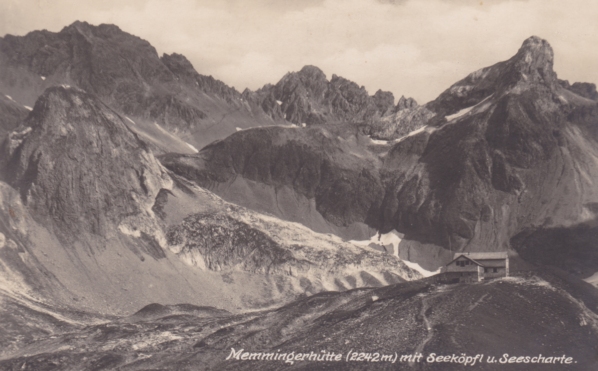 Memmingerhütte mit Seeköpfl und Seescharte - Foto Josef Gail - Karte gelaufen 1927