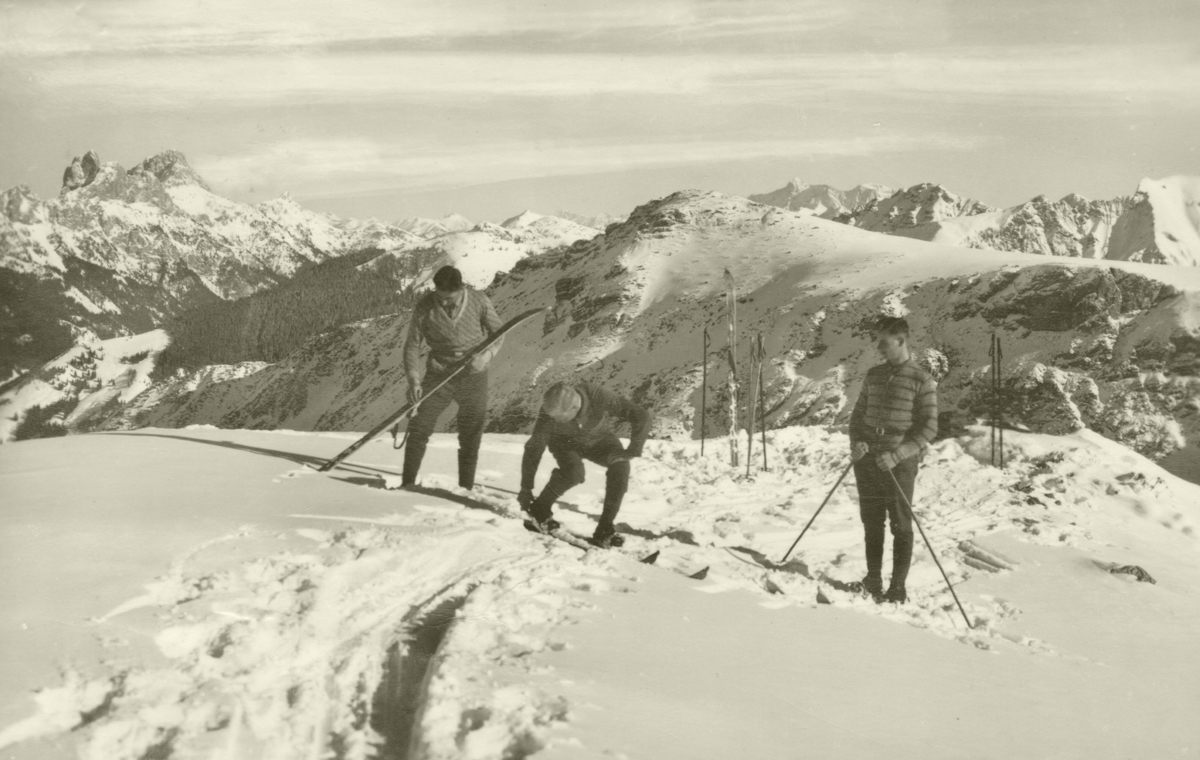 Skifahrer bereiten sich für die Abfahrt vom Zirleseck vor - Fota A. Gehring - gelaufen 1930 (?)