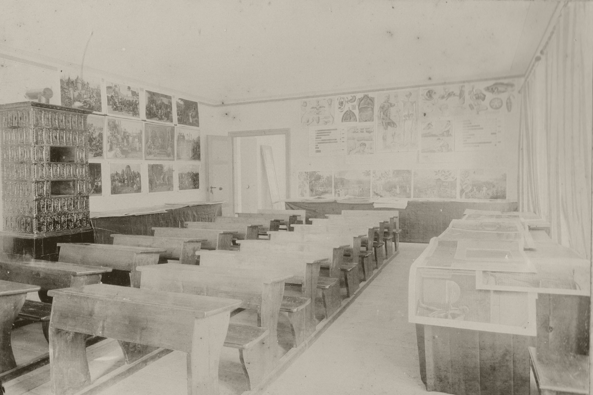 Lehrmittel-Ausstellung der Volksschule Reutte 1898 - eingerichtetes Schulzimmer (Klassenzimmer)