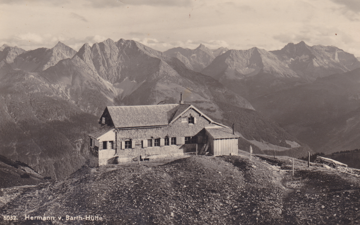 die Hermann v. Barth-Hütte mit Blick in die Lechtaler Alpen hinein - Verlag J. Heimhuber - Karte gelaufen 1938