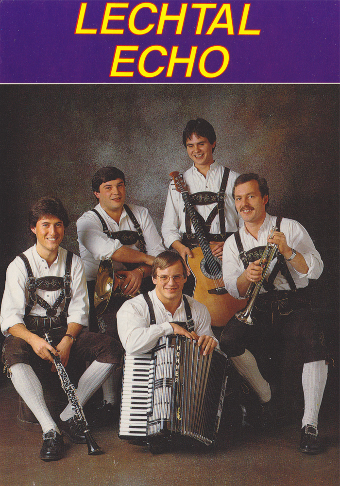 die Gruppe Lechtal Echo - etwa Anfang / Mitte der 90er Jahre - Besetzung: Gerhard Dirr (Klarinette), Hubert Tröber (Gitarre), Hans-Dieter Friedle (Akkordeon), Richard Kerber (Trompete) und Erich Scheiber (E-Bass, Bariton)