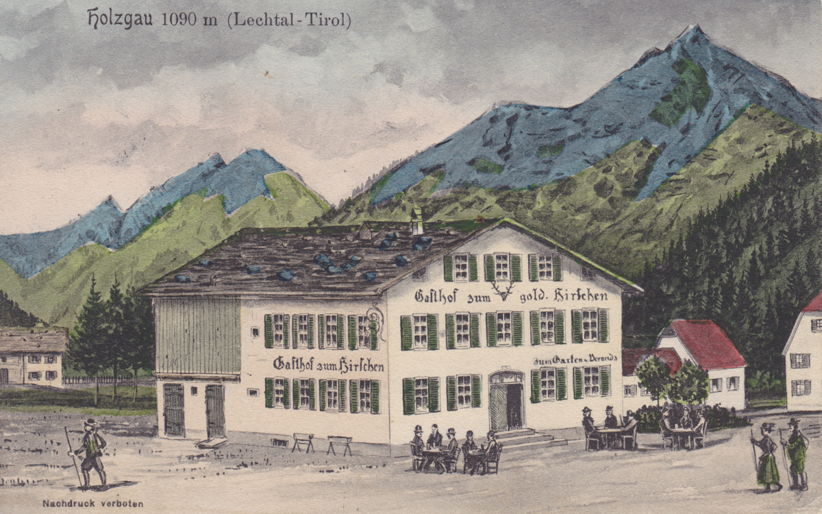 Gasthof zum goldenen Hirschen in Holzgau - Kunstdruck Hans Pernat - Karte gelaufen 1906