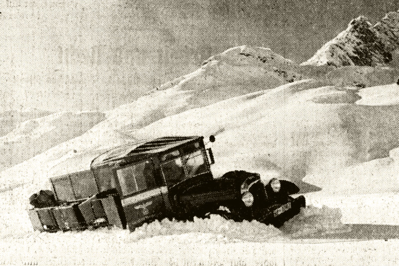das 'Raupenbandfahrzeug' der Reichspost quält sich in Richtung Zürs durch den tiefen Schnee - Foto: Franz Nußbaumer (1941)