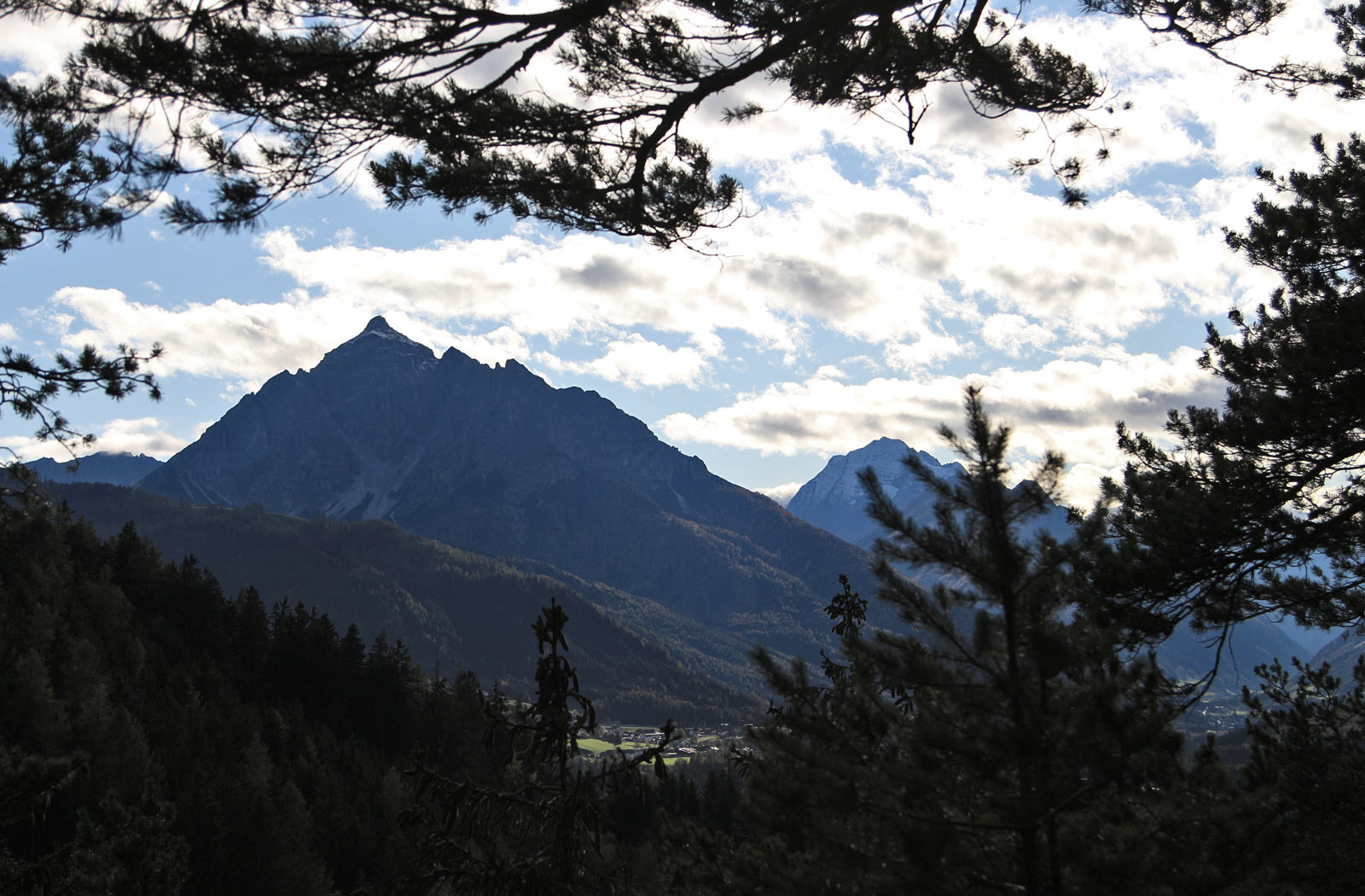Ausblick vom Kultplatz am Goldbichl zu der südlich aufragenden Serles