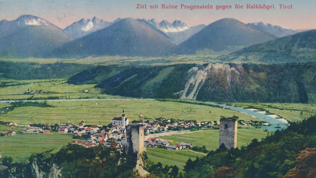 Zirl mit Ruine Fragenstein gegen die Kalkkögel - Foto: Wilhelm Stempfle - gel. 1918