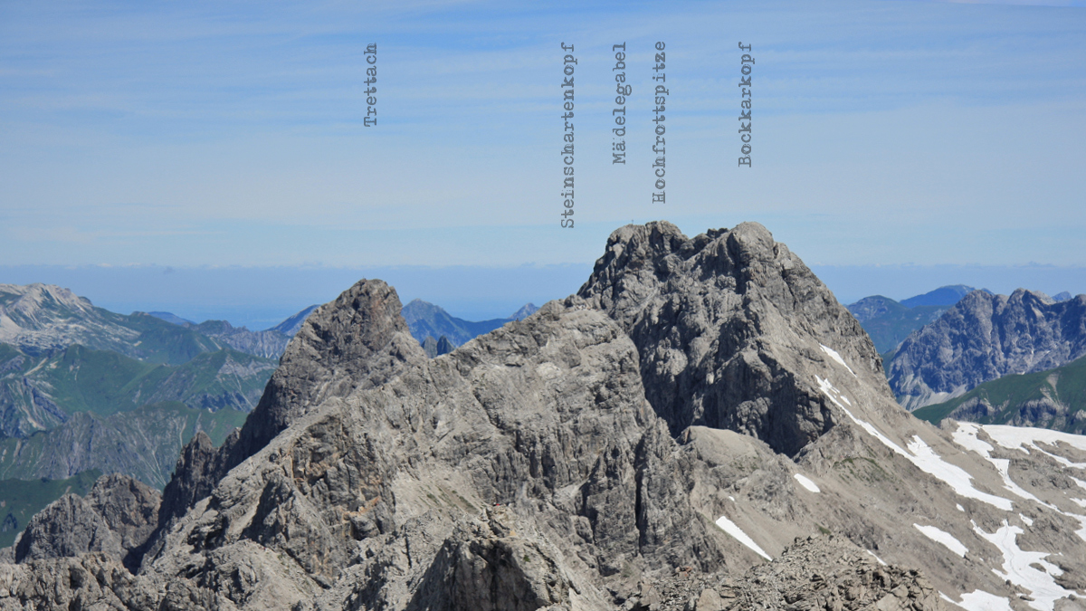 Blick vom Hohen Licht über einen Teilabschnitt des Heilbronner Wegs mit Steinscharten-, Bockkarkopf, Hochfrottspitze und Mädelegabel
