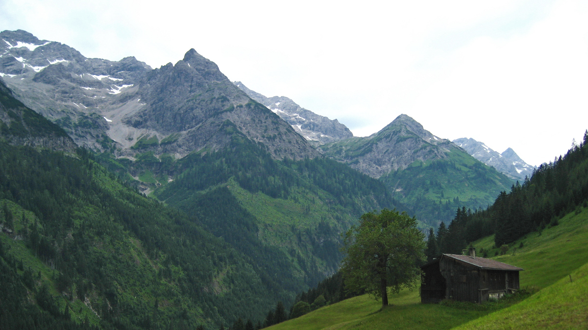 Ausblick vom Pretterhof bei Hinterhornbach auf die beiden markant aus der Hornbachkette nach Norden ausstreichenden Gipfel von Bretterkarspitze (li.) und Schreierkopf