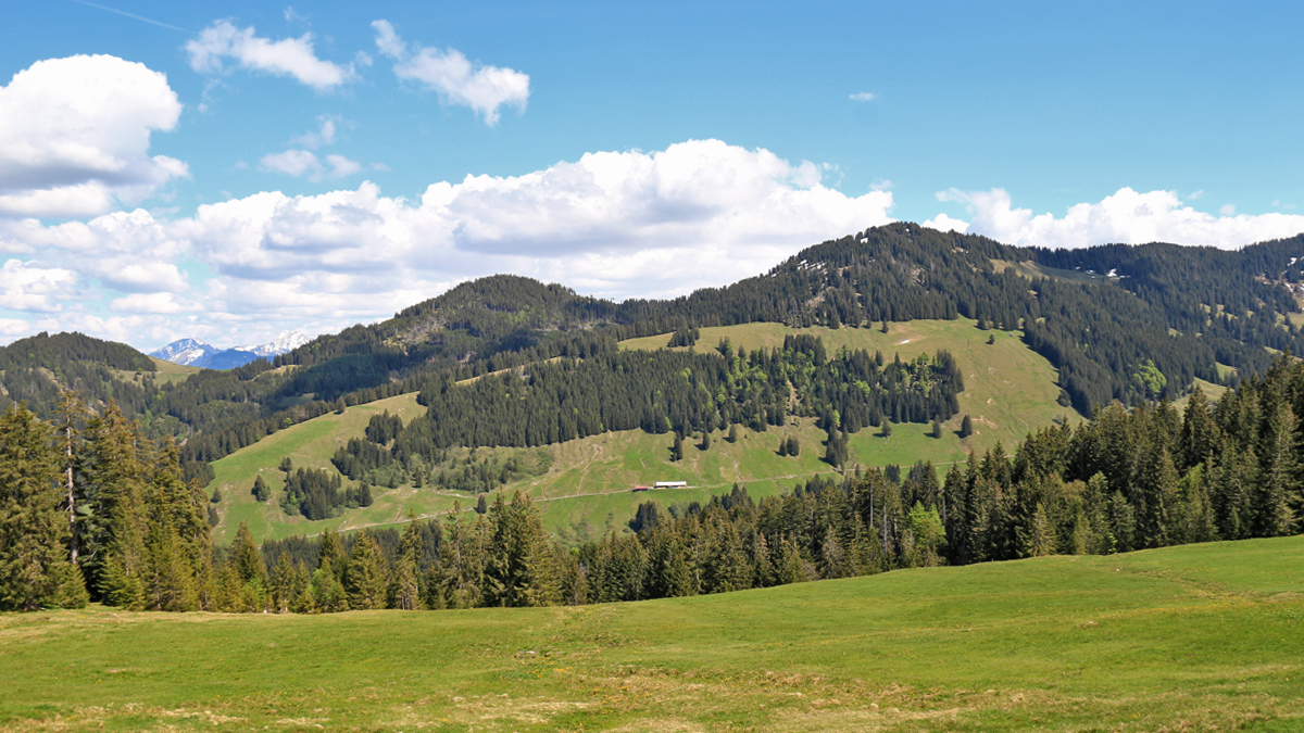 Blick vom Ostertalberg auf (v.l.) das Ofterschwanger Horn (1406 m), das Sigiswanger Horn (1527 m) und das Rangiswanger Horn (1616 m) - unterhalb die Holzschlagalpe
