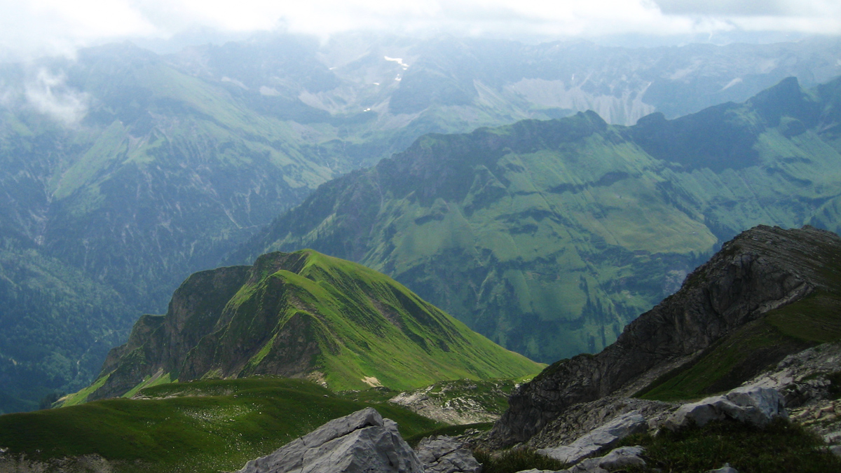 Gipfelblick vom Großen Daumen auf die grünen Matten der Laufbichlkirche - im Hintergrund der Giebel und das im Gratverlauf südlich befindliche Berggächtle