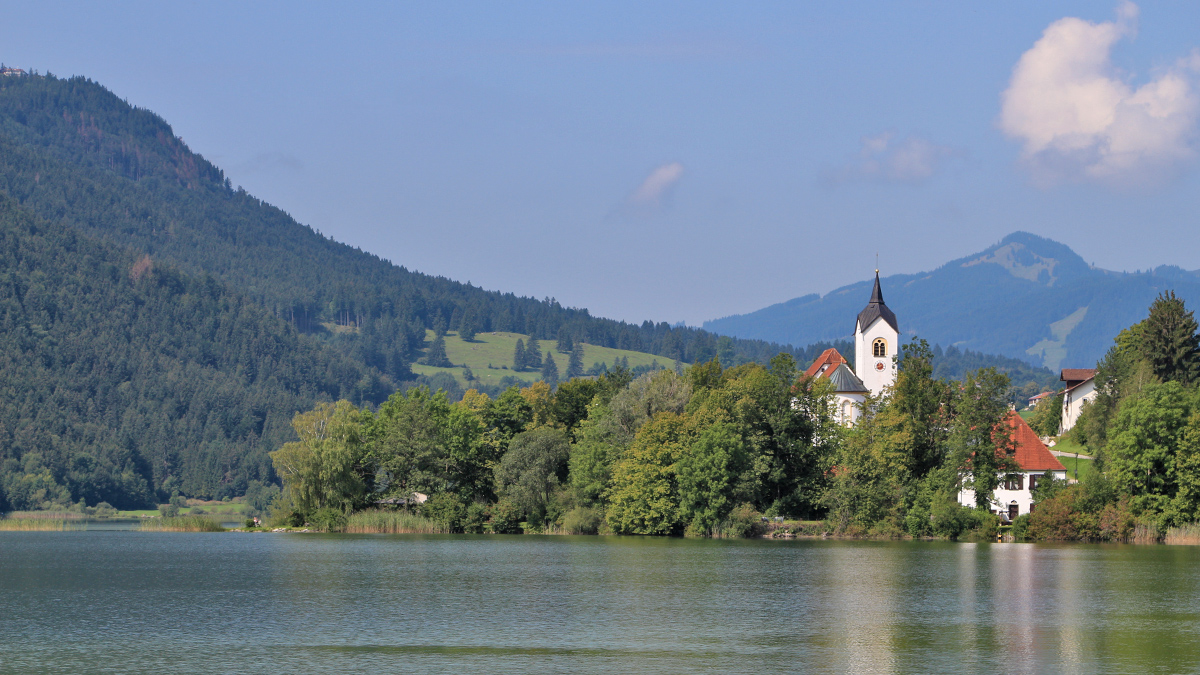 seit 1978 zu Füssen gehörig - die ehemalige Gemeinde Weißensee am gleichnamigen See (Ostallgäu) und der im Kern im 12. Jahrhundert entstandenen Pfarrkirche St. Walburga