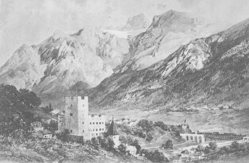 Das Schloss Landeck mit Blick zur Parseierspitze in den Lechtaler Alpen (gez. von E. T. Compton, 1887)