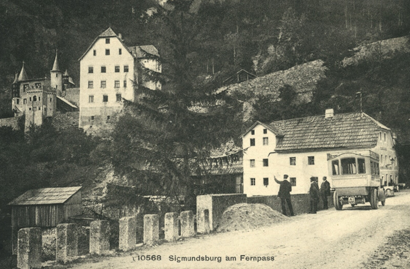 auf der Karte fälschlich als Sigmundsburg tituliert, erblickt man tatsächlich die alte Klause am Fernpass (Fernstein) - Karte von 1912