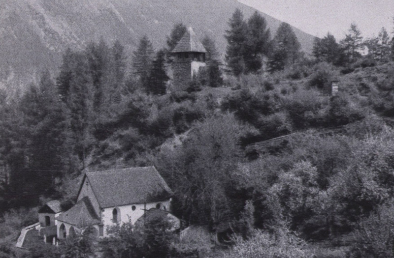 Obsaurs: die alte Vigiliuskirche und darüber der Wartturm, in dessen nahem Umfeld eine rätische Siedlung der Breonen bestand, unter anderem ausgestattet mit einem zu damaliger Zeit typischen Brandopferplatz