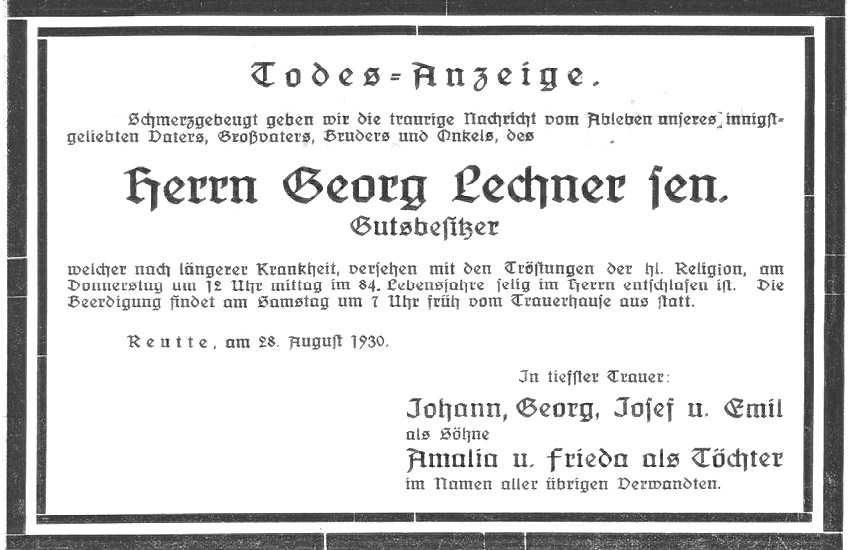 Georg Lechner sen. † Am Dienstag mittag starb auf der Klause im Alter von 84 Jahren der Gutsbesitzer Georg Lechner, vulgo Klausemer Jörgl. Als junger Mann versah er im Herrenrauth auf der neuen Straße das Amt eines Mauteinnehmers. Nachdem diese Maut aufgelassen worden war, übernahm er den Besitz seines Vaters, die alte Burg auf der Klause, an der er mit Leib und Seele hing. Neben der Bewirtschaftung seines Gutes trieb Lechner auch einen schwunghaften Holzhandel, durch den er nicht nur im ganzen Bezirke, sondern auch im benachbarten Bayern bekannt wurde. Man erzählt sich heute noch von ihm, er habe viele Waldteile, die andere Holzhändler verschmähten, weil das Holz daraus schwer wegzubringen war, aufgekauft, abgeholzt und trotz mancherlei Hindernisse das Holz zu Tal gebracht. Der Heimgegangene war ein Mann von altem Schrot und Korn, der besonders in seinen alten Tagen durch patriarchialisches Aussehen auffiel. An seiner Bahre trauern sechs erwachsene Kinder und eine große Schar Enkelkinder.