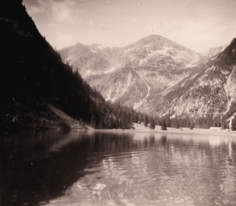 eine Bootsfahrt auf dem Vilsalpsee, im Hintergrund die Vilsalpe und das Kugelhorn - Foto: privat - vermutlich Anfang 1960er