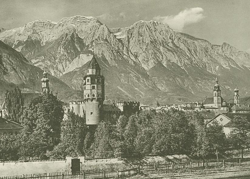 die alte Salinenstadt Hall am Inn gegen den Bettelwurf - aus: Mein schönes Land Tirol, Hanns Barth (1933)