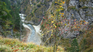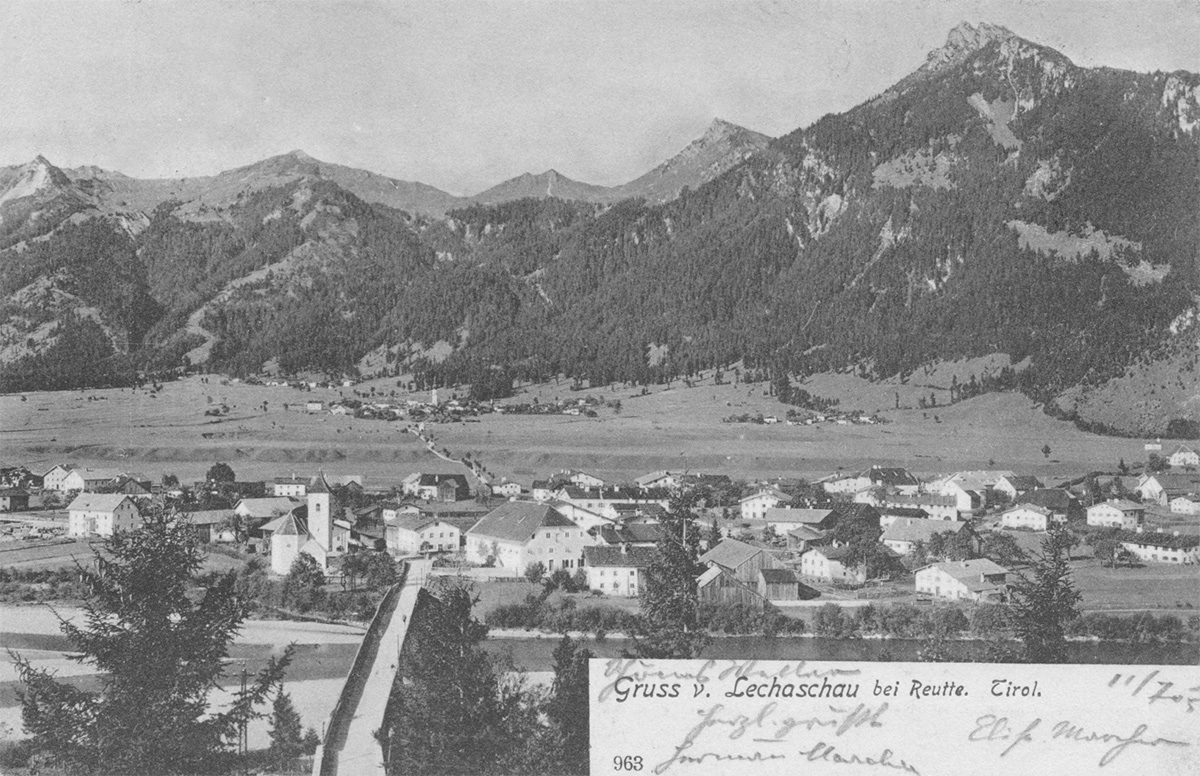...die Straße zieht bald an malerischen Gehöften vorüber, bald biegt sie um vorspringende Felsenecken an denen unten der Lech sich schäumend bricht, oder sie zieht an langen öden Felsenwänden hin...