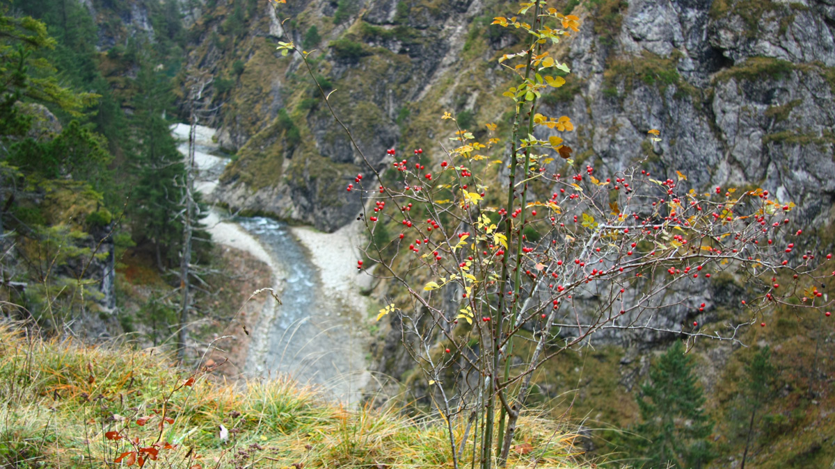 "...in Weißenbach, einem Dorfe am Eingange des Lechthales, theilt sich die Straße. Einer ihrer Arme leitet südwestlich in das erwähnte Thal, der andere führet nordwestlich zwischen sehr hohem, schroffem Gestein durch ein wildes und unfruchtbares Thal an der rechten Seite des Gebirges, die Gacht genannt. In der finsteren Tiefe toset ein Wildbach dem Lechflusse zu. Hart an der Straße schichten sich in hangenden Massen, den Einsturz drohend, die Felsenlasten himmelan, und der Wanderer steigt mit Schauer, wenn er zur rechten Seite die jähen Steinwände betrachtet, und mit Grausen, wenn er einen Blick nach der brausenden Tiefe wendet, den steilgebahnten Weg hinauf. Es ist, als gälte es, die erste furchtbare Schutzwehr zu durchdringen, die die Natur, das Alpenland bewahrend, um das Herz ihres Lieblings-Landes gebauet hat. Mit Ehrfurcht und staunender Bewunderung führt sie den Fremden in unsere starke Heimath ein, und lehret ihn die Thäler heilig achten, um welche sie ihren schöpferischen Riesenarm schlang. Groß und unbezwingbar muß ihm das Volk erscheinen, daß innerhalb dieser unerschütterlichen Mauern seine Hütten hat..."