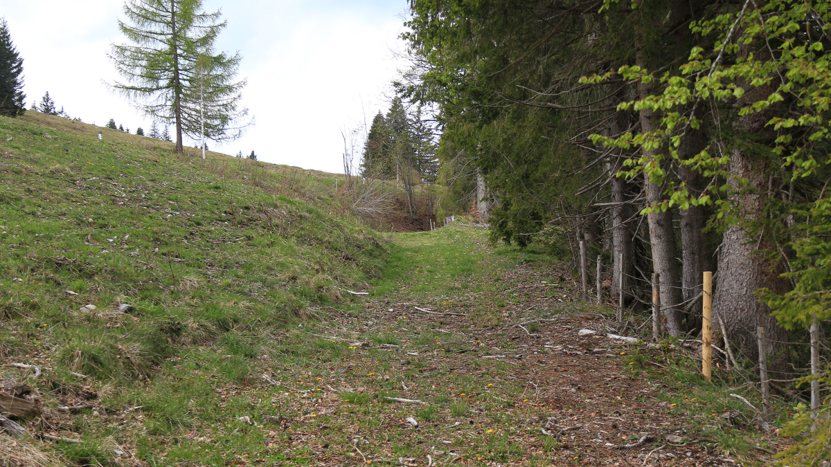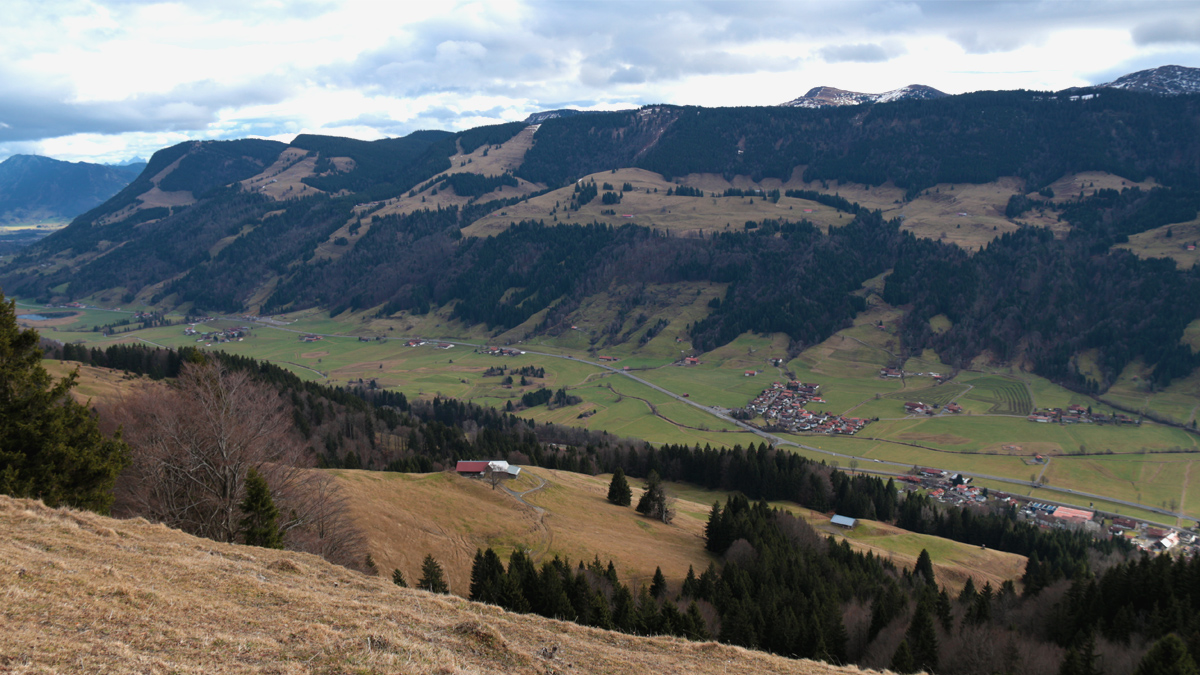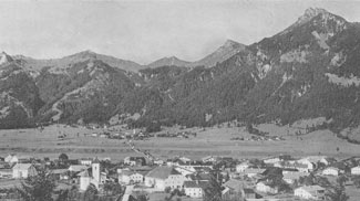 Nach Überwindung der Tobel und Brücken führte die Straße über das sogenannte Krumme Ried - eine Ebene mit kleinem Pestfriedhof - steil hinauf zu dem Wegkreuz an der sogenannten "A´sötze" (die Fuhrleute "setzen hier ab", um zu bremsen oder den Radschuh unterzulegen) am Eingang in das Tannheimer Tal, bei dem politisch noch zu Weißenbach gehörenden Weiler Gaicht. nach oben