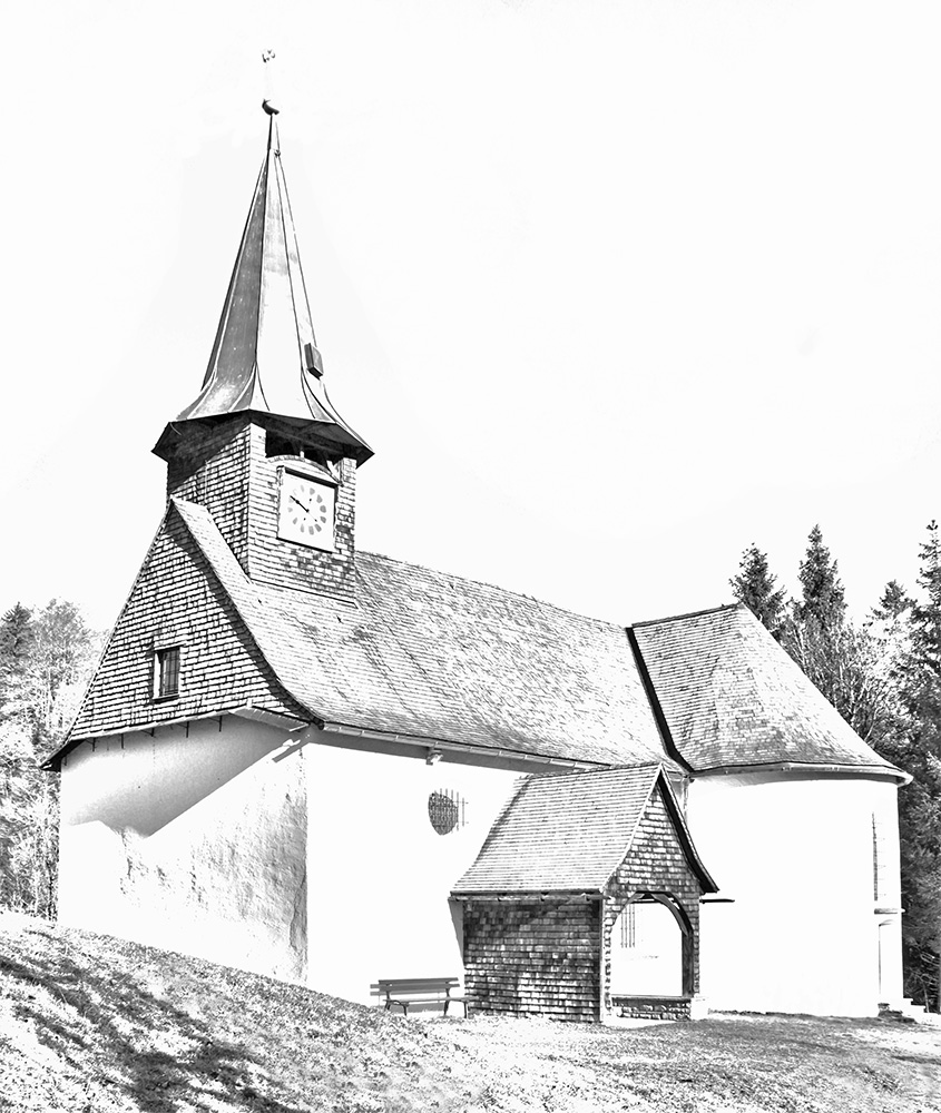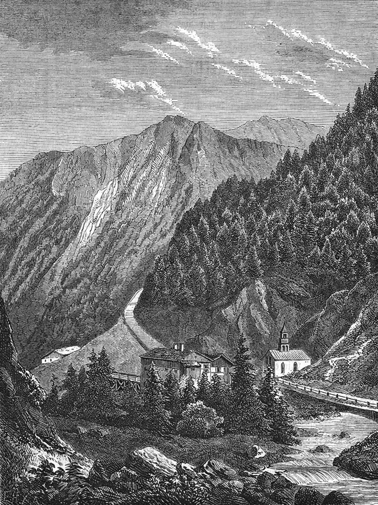 "...sie zuletzt nur einer Kapelle spärlichen Raum gewähren, die ihren Ursprung dem frommen Sinne der Fuhrleute verflossener Jahrhunderte verdankt und wohl auch den bangen Gefühlen, mit denen sie den Schrecknissen der Gacht sich nahten. So heisst nämlich die Passstrasse, welche eben bei diesem Kirchlein einen scharfen Anstieg nimmt, um nach vier Minuten beim Gachtwirtshause etwas sanfter nach rechts abzubiegen...