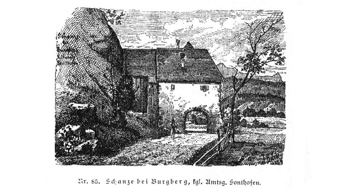 Weiter über Staig, führt die Trasse hinab und vorüber an der Burgruine Fluhenstein. Durch Berghofen und weiter nach Burgberg, wo zur Zeit der Salzfuhren das untere Tor am Burgweg passiert werden musste.