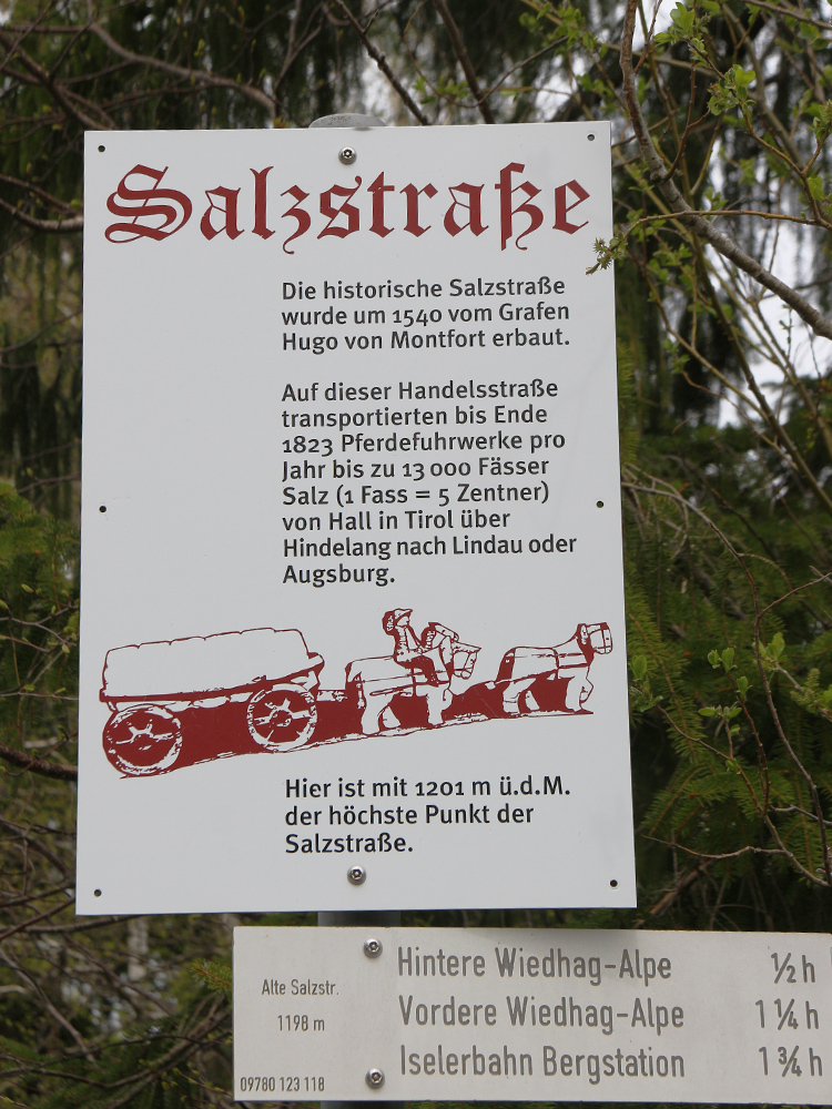 1494 verlegte man, um die Zollabgaben an die Bischöfe von Augsburg zu umgehen, die Strecke weiter gegen Süden, wobei man fortan über Liebenstein die Steigung hinauf nach Imberg hinter sich bringen musste. Von dort hinab nach Binswangen, Sonthofen und schließlich Rieden an der Iller, zu der durch Graf Hug von Montfort neu errichteten Oberzollbrücke. Westlich der Iller gelangt man letztlich über Bihlerdorf und Blaichach nach Immenstadt. Immenstadt war mit den Burgen Hugofels und Rot(h)enfels ab 1332 der Herrschaftssitz der Montforter. Am 22. Juli 1360 erlangte das vormalige Immendorf das Stadtrecht. Die Salztransporte sorgten neben zahlreichen anderen Handelsgütern in Immenstadt für eine erfreuliche, wirtschaftliche Entwicklung. Als Salzrodstation hatte es das Niederlagsrecht inne, welches wiederum von einem Salzfaktor verwaltet wurde. 1544 wird ein Salzstadel genannt und 1560 schließlich vom Bau eines neuen Salzstadels berichtet - ganze 48 Meter lang und 12 Meter breit.