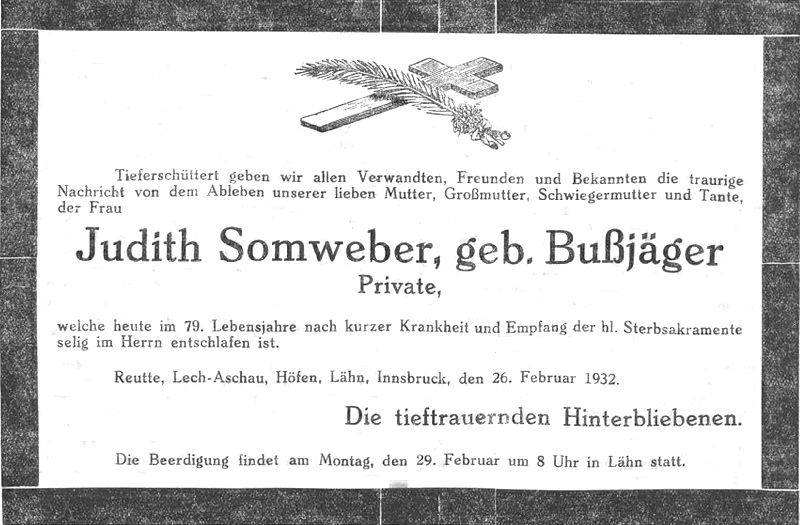 Aus: Außferner Bote vom 27. Feb. 1932 Lähn. Tief betrauert von ihren zahlreichen Kindern und Verwandten verschied hier gestern im Alter von 79 Jahren Frau Judith Somweber geb. Bußjäger nach kurzer Krankheit. Mit ihr ist eine arbeitsame, von allen geachtete und geschätzte Frau von hinnen gegangen. Die Verstorbene ist die Mutter des Sprengelarztes für Reutte und Umgebung Dr. Alois Somweber und des Schulleiters Somweber von Höfen.