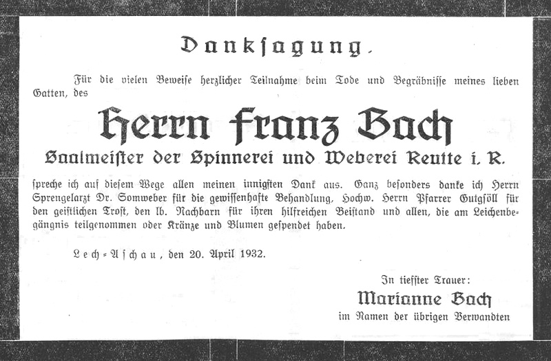 Lech-Aschau. Montag abends 9 Uhr verschied hier der weitum bekannte Herr Franz Bach an den Folgen einer Wassersucht, an welcher er schon längere Zeit zu leiden hatte. Bach wurde im Jahre 1852 geboren und kam in jungen Jahren als Maurer weit in Deutschland herum. Im Jahre 1879 trat er dann bei der hiesigen Fabrik als Weber in Dienst und brachte es durch seine Tüchtigkeit bis zum Saalmeister, welchen Posten er bis zum Jahre 1921 versah. Seine erste Frau und ein Kind aus dieser Ehe sind ihm vor vielen Jahren schon im Tode vorausgegangen, die zweite Ehe war kinderlos. Seine hochbetagte Frau und eine Ziehtochter, die mit Herrn Postmeister Purtscher verheiratet ist und in deren Familienkreis unter liebevoller