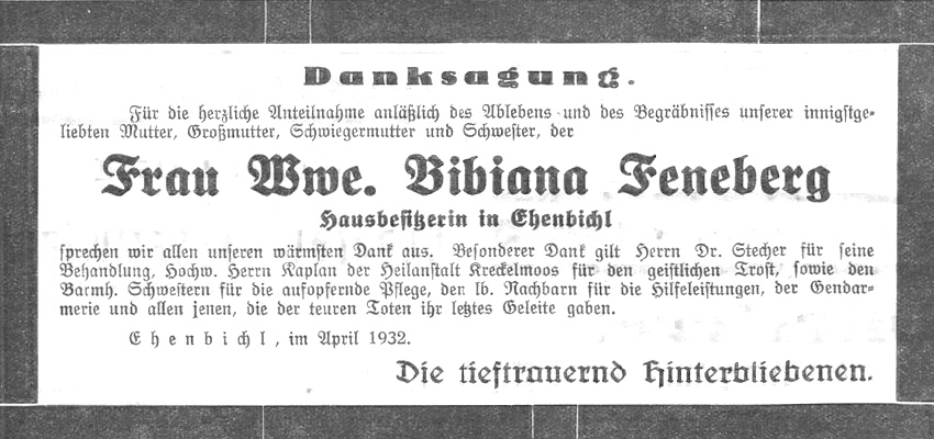 Ehenbichl. Im 67. Lebensjahre starb in der Heilanstalt Kreckelmoos am 23. ds. Frau Bibiana Feneberg. Die Verstorbene, die im Jahre 1923 durch den Tod ihren Gatten verlor, hinterläßt 7 erwachsene Kinder. Ein Sohn starb an den Kriegsfolgen im Jahre 1926. Frau Feneberg war eine gute, christliche, treubesorgte Mutter, deren Hinscheiden nicht bloß von den Ihrigen, sondern auch von allen, die sie kannten, betrauert wird.