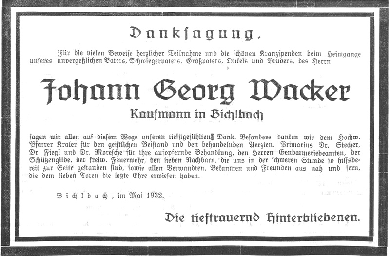 Bichlbach. Am 21. starb hier im Alter von 68 Jahren Kaufmann Johann Georg Wacker nach schwerem, mit großer Geduld ertragenem Leiden. Während des Krieges, in den er mit den Standschützen zog, wurde er schwer verwundet. Wacker war auch 20 Jahre lang Fähnrich bei der Schützengilde Bichlbach und wurde zu deren Ehrenmitglied ernannt. Der Verstorbene hinterläßt 3 Söhne unb 3 Töchter. Ein Sohn ist der Besitzer des hiesigen Gasthofes zur Post, ein anderer Postmeister in Ehrwald, während der 3. das Postamt in Bichlbach leitet. Seine Frau ging ihm schon