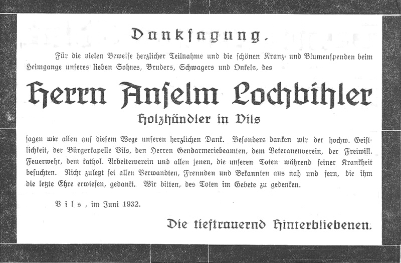 Vils. Im Alter von 34 Jahren starb in der Innsbrucker Klinik Herr Anselm Lochbihler. Ein langwieriges Kopfleiden hat den noch jungen Mann dahingerafft. Der Verstorbene, welcher als Händler weit über die Grenzen des Bezirkes hinaus bekannt war, ist ein Neffe des vor Jahren in Graz verschiedenen P. Anselm Sonnweber, der lange Zeit als Katechet im Franziskanerkloster in Reutte weilte. Um den Heimgegangenen trauern die vom Schmerze tiefgebeugten Eltern und 6 Geschwister.