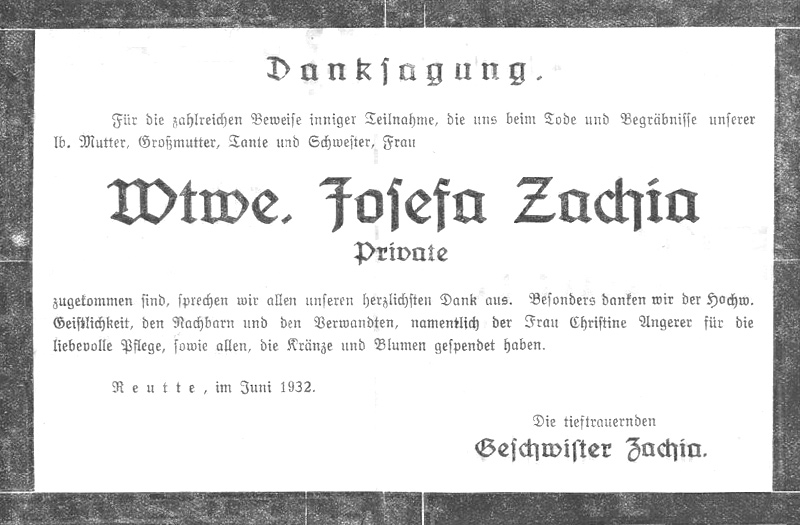 Frau Witwe Josefa Zachia † . Im gottgesegneten Alter von 80 Jahren starb am Samstag um halb 12 Uhr nachts Frau Witwe Josefa Zachia an den Folgen eines Schlaganfalles. Obwohl sie schon seit längerer Zeit kränklich war, kam ihr Tod doch unerwartet schnell. Die Heimgegangene, eine Schwester des nunmehr in Gott ruhenden Kaufmannes Johann Schennach, war 52 Jahre lang mit dem am 2. Juni 1929 verstorbenen Alois Zachia verheiratet. Aus dieser Ehe entsprossen 10 Kinder, von denen noch 5 am Leben sind. Eine Tochter, Frau Louise Danklmann, weilt seit 1905 in Amerika, von wo sie ihren alten Eltern ständig Unterstützungen zukommen ließ, aber auch an ihre Bekannten in der Heimat sandte sie während des Krieges manche Dollarspende, weshalb auch bei ihrem Besuche in Reutte ein großer Freundeskreis sie herzlich empfing und von ihr innigen Abschied nahm. Ein Sohn, Hermann mit Namen, weilt ebenfalls in Amerika, ein anderer, namens Louis, ist derzeit Betriebsleiter des Elektrizitätswerkes Häselgehr, während Josef, der jüngste Sohn, bei seiner Mutter in Reutte verblieb. Die 2. Tochter Julie lebt in Dornbirn. Der einzige Bruder der Verstorbenen ist der Postoberkontrollor i.R. Schennach in Innsbruck. Vor dem Kriege betrieb die Heimgegangene mehrere Jahre hindurch in Reutte ein Stellenvermittlungsbüro.
