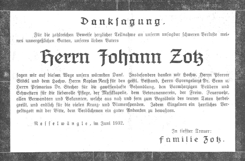 Nesselwängle. In der Heilanstalt Kreckelmoos verschied am 18. Juni nach schwerem Leiden Herr Johann Zotz im 58. Lebensjahre. Als Sohn eines hiesigen Bauern und Stukkateurs geboren, kam er mit 14 Jahren nach Wien in die Zeichenschule und ging alsdann nach deren Beendigung mit seinem Vater in die Fremde, um Stuck- und Marmorarbeiten zu erlernen. 42 lange Jahre hat sodann der Mann in den Städten verschiedener Staaten geschafft; so besonders sind die Stuckarbeiten der Gnadenkirche in Maria Einsiedeln sein und seiner Brüder Werk. Nur kurze Zeit im Winter weilte er jedes Jahr in seiner Heimat bei seinen Lieben und auch da rasteten seine Hände nicht. Der Welterfahrene schuf im Verein mit anderen eine kleine Dorfbühne und es wurde da an langen Winterabenden frisches, geselliges Leben gepflegt; man hört auch heute noch gern aus jener guten alten Zeit erzählen. Im Weltkriege rief ihn das Schicksal an die italienische Front. Wahrlich auf Rosen gebettet war „Zotze Hans" nicht und ein mühevolles, arbeitsreiches Leben liegt hinter ihm. Aber er war ein ganzer Mann mit einem immer sonnigen Gemüte und hat sich die Heiterkeit trotz alles Schweren bis zum letzten Tage nicht nehmen lassen. Wir haben an ihm viel verloren. Wie hoch er geschätzt wurde, bewies auch die große Teilnahme in den letzten Wochen, als ihn viele Freunde und Bekannten in der Heilanstalt Kreckelmoos besuchten. Freiwillige Feuerwehr, Heimkehrer, Musikkapelle und zahlreiche Verwandte und Bekannte aus nah und fern gaben dem Verblichenen das letzte Geleite. Von seiner Beliebtheit zeugen auch die vielen Kranz- und Blumenspenden, sogar Rosen waren auf seinem Grabe zu sehen, für uns wohl völlig Fremdes. Wir wünschen dem Heimgegangenen ewige Ruhe, Frieden und ewigen Lohn für all seine guten Taten.