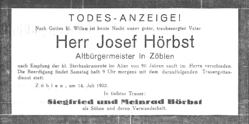 Aus: Außferner Bote vom 16. Juli 1932 Zöblen. Hier starb am Mittwoch, den 14. Juli im Alter von 90 Jahren Herr Altbürgermeister Josef Hörbst. Der Verstorbene hinterläßt 2 Söhne.